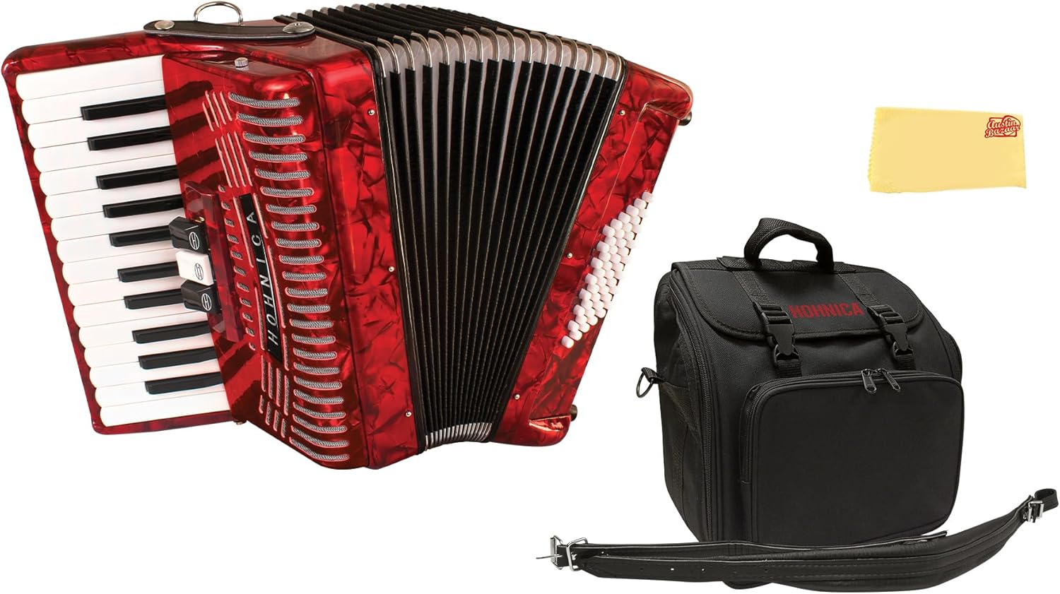 The Hohner 1304 Pearl Red Hohnica Accordion is the perfect start for the beginner accordion player in your life. Hohner has worked tirelessly to improve the features on this new version of the Hohnica. Comes in an ultra-stylish, bright pearlescent red color and it has a full, vibrant sound.